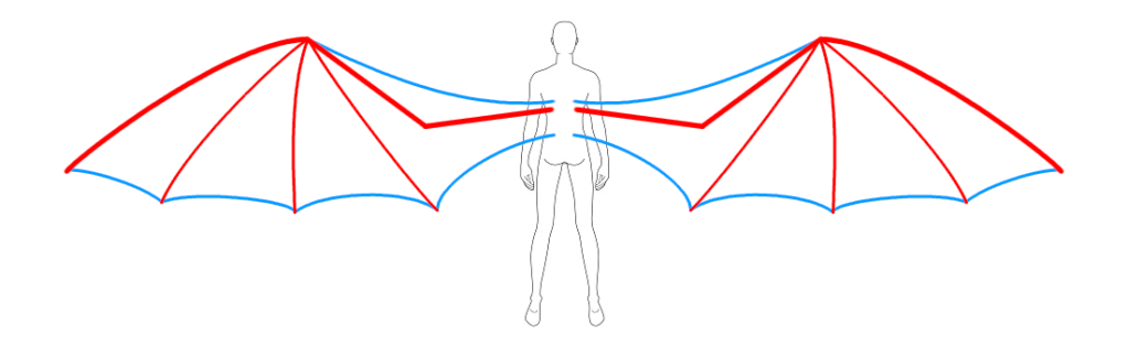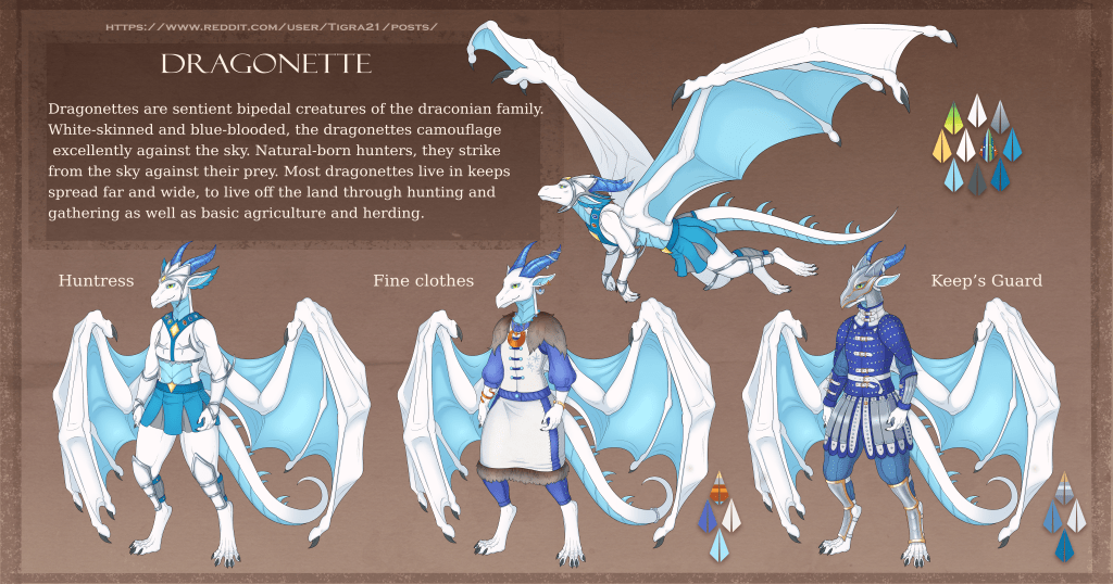 Humanoid draconic sentient creature. They have back-mounted wings on their lower back for six limbs in total, plus a tail, and their legs have a digitigrade stance. Dragonettes are very flexible compared to humans, giving them great agility in the air. They have thick leathery silvery-white skin with large blue scales on the front of the neck/torso and underside of the tail, blue inner wing membranes, green eyes, and copper-based blue blood. Dragonette hearing, low-light vision, and distance vision are all somewhat better than human, but their near field vision is slightly worse and they are somewhat more vulnerable to their senses being overwhelmed by bright light or loud sound. They are cold-blooded, as a result they are vulnerable to extreme heat and cold, and can also overheat more easily from too much physical activity. Dragonettes have somewhat slower metabolisms than humans and as a result sleep more and don’t eat quite as much, and their diet also relies more heavily on meat than a human’s.