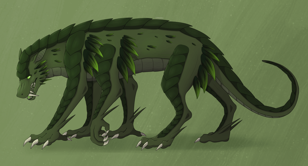 A medium-sized six-legged pack-hunting beast named for the god of the hunt. They sport a vaguely canine appearance and hunt in packs. They are swift hunters with great endurance, particularly for a land bound creature. Their bite delivers a venom similar to the green dragon’s, which proves fatal for most creatures even from a single bite. The living poison also breaks down the target much as one may expect from a digestive enzyme, making the meat tender and easy to consume, though sadly toxic to any save the Naulikers themselves.